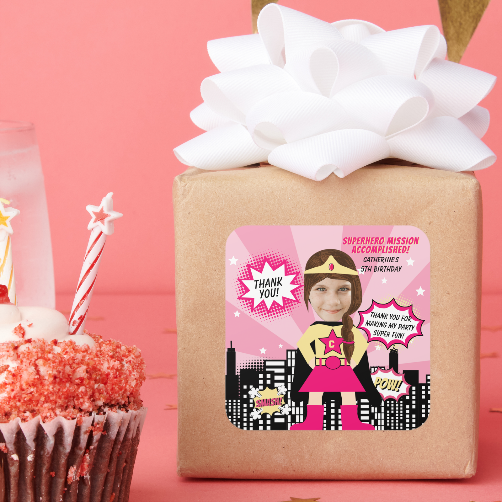 Transform your little girl into the ultimate superhero with this personalized comic book–style photo sticker! Featuring a pink cityscape backdrop, dynamic speech bubbles, and classic comic sound effects like “POW!” and “SMASH!”, this square sticker delivers an authentic superhero vibe with a feminine twist. The child’s face is placed on an illustrated superhero character for a fun and unique design that adds a custom touch to party favors, treat bags, and thank-you gifts. With a bold “Thank You!” message and space for personalization, this high-quality sticker is the perfect finishing touch for any girl’s superhero birthday celebration.