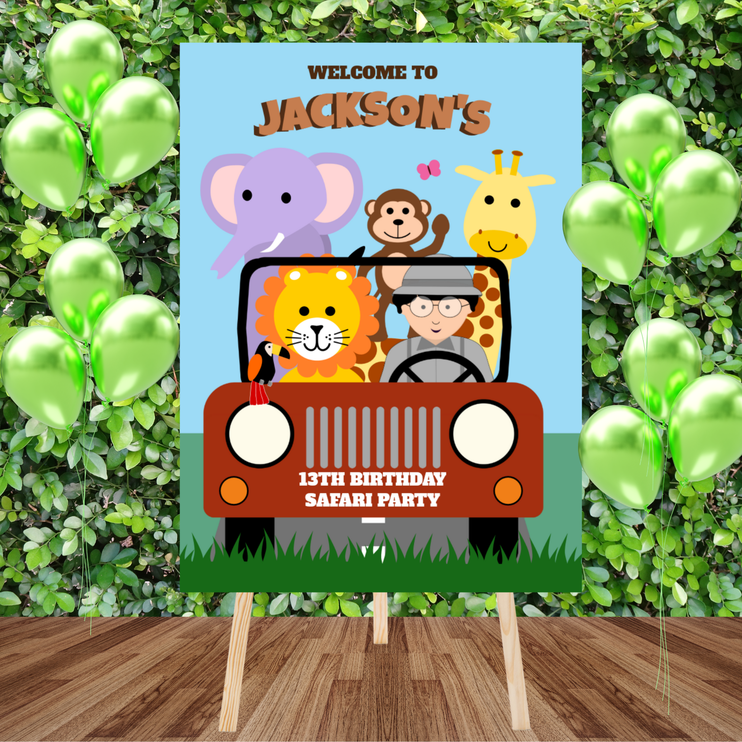 Welcome guests in style with this vibrant jungle safari-themed birthday sign! Featuring a friendly safari jeep filled with adorable animals—lion, elephant, giraffe, monkey, and even a toucan—this colorful design instantly sets the tone for a fun-filled celebration. Perfect for kids’ birthdays, “Wild One” parties, or zoo-themed events, this sign greets visitors with cheerful charm and adventurous spirit. Surrounded by bright green balloons and lush greenery, it makes a fantastic photo backdrop as well as a practical welcome display. Durable and eye-catching, this safari party sign adds excitement from the moment guests arrive, making your celebration truly memorable from start to finish.