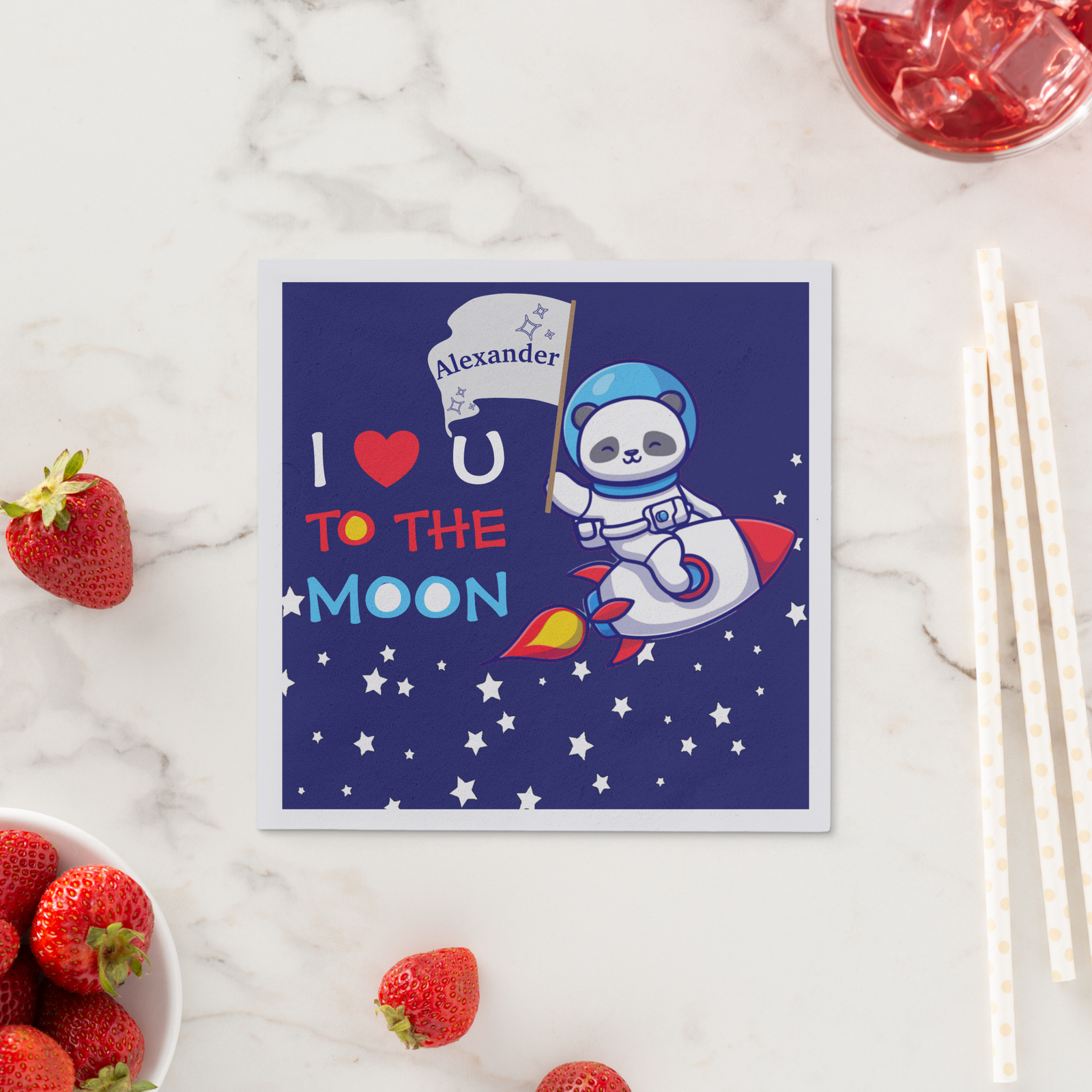 Bring an extra dash of cuteness to your outer space celebration with these personalized panda astronaut napkins! Featuring an adorable kawaii-style panda riding a rocket ship and waving a custom name flag, this navy blue design is accented with playful “I ❤️ U TO THE MOON” typography and scattered twinkling stars. Perfect for baby boy birthdays and toddler space-themed parties, these high-quality napkins are both decorative and functional—ideal for serving snacks, desserts, and party treats. The charming cartoon artwork adds a cohesive touch to your table décor and delights little guests while making the celebration feel unique and personalised.